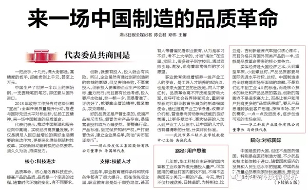 3月7日湖北日報頭版頭條報道全國人大代表馬新強關于“品質革命”的觀點; 創(chuàng)新的落腳點不是追求高大上,而是讓客戶和用戶擁有更多的“品質獲得感”,要從產品思維轉換到客戶思維,按照市場、客戶的需求,一點一點改進技術,逐步創(chuàng)造可觀的市場空間。