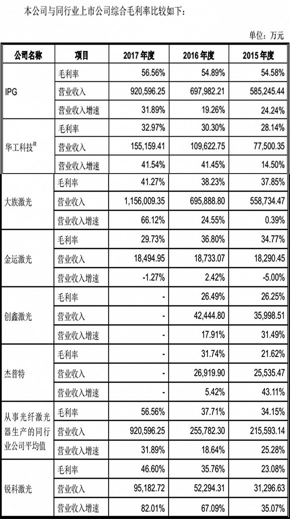 然而,相對于IPG等企業(yè),銳科激光仍有不小的差距。從銳科激光的招股說明書可以看到,2015年至2017年,盡管該公司綜合毛利率從23.08%不斷增加至46.6%,但仍低于IPG公司多年來保持在55%左右的綜合毛利率水平,甚至低于從事光纖激光器生產(chǎn)的同行公司平均值。