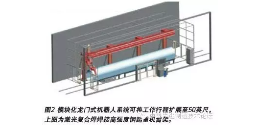 激光復(fù)合焊的靈活度和焊接質(zhì)量關(guān)鍵在于使用適合的機(jī)器人,同時(shí)配置相應(yīng)的激光工具頭和焊槍系統(tǒng)。要求較高的路徑精度和重復(fù)定位精度,因此徠斯高強(qiáng)度的龍門式機(jī)器人系統(tǒng)非常適用。龍門式機(jī)器人擁有較大的工作范圍,可加工大型工件,同時(shí)節(jié)省地面空間(見圖2)。龍門式機(jī)器人配置成為機(jī)器人三維運(yùn)動(dòng)最大的柔性可能。