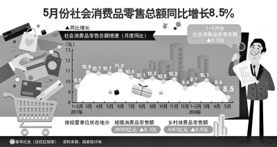5月份,社會消費品零售總額增長8.5%,比4月份回落0.9個百分點,為什么5月份社會消費品零售總額增速比4月份回落?毛盛勇分析主要有兩個原因,第一個原因是假日移動效應,去年端午節(jié)的假期是在5月份,今年的端午假期是在6月份,經(jīng)過測算,三天的假日消費就影響了社會消費品零售總額回落1個百分點以上,這是假日的錯月效應帶來的影響。第二個原因是延期消費效應,最近國務院公布了7月1日開始起對汽車還有部分日用品降低關(guān)稅,不少消費者減少當期消費。這些影響加在一起造成了5月當月社會消費品零售總額增速有所回落,但是連續(xù)起來看還是比較平穩(wěn)、比較快的。這些因素都是短期因素,下一步,社會消費品零售總額有條件繼續(xù)保持平穩(wěn)較快增長。