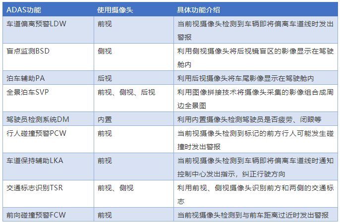 車道偏離預警(LDW)、前向碰撞預警(FCW)、交通標志識別(TSR)、 車道保持輔助(LKA)、行人碰撞預警(PCW)、全景泊車(SVP)、駕駛員疲勞預警等眾多功能都可借助攝像頭實現(xiàn),有的功能甚至只能通過攝像頭實現(xiàn)。