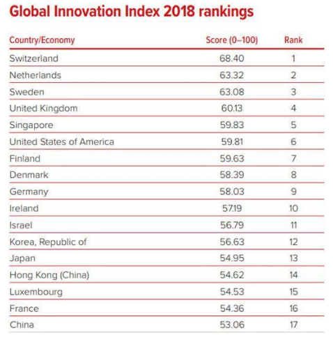 近日,聯(lián)合國“世界知識產(chǎn)權組織”發(fā)布了一份2018年度最新的“全球創(chuàng)新指數(shù)”排名,中國大陸首次進入了世界前20的行列,從去年的第22名升至第17名,而美國則從全球第4下跌到了第6。