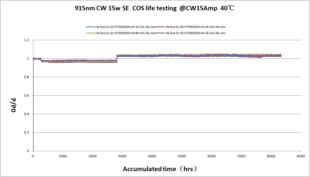 圖4:915nm 190?m發(fā)光區(qū)域寬度、4mm腔長的芯片,封裝為COS后在15W連續(xù)輸出功率下的長期老化測試情況。
