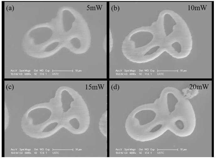 圖形化光場投影加工雖然可以快速加工二維微納米結(jié)構(gòu),但是缺乏加工三維結(jié)構(gòu)的能力,針對這一缺陷,該課題組通過在空間光調(diào)制器上加載驅(qū)動信號,可以控制焦點在三維方向上的移動,同時,通過對閃耀光柵和球面波因子函數(shù)的編碼排序,實現(xiàn)了飛秒激光焦點沿著預(yù)設(shè)的三維路線上的可控掃描加工,并對掃描工藝參數(shù)進行了定量化研究,從而實現(xiàn)了三維結(jié)構(gòu)的單點掃描加工(如圖2)。