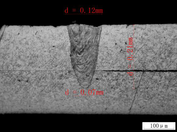激光焊接薄板異種材料時(shí),極易出現(xiàn)虛焊、裂紋、連接強(qiáng)度低等問(wèn)題,這是由于兩者的物理性能差異大,互溶度低,且極易生成脆性化合物,這些化合物使焊接頭的力學(xué)性能大大降低。選用高光束質(zhì)量的納秒級(jí)激光通過(guò)高速掃描方式,精準(zhǔn)的控制熱輸入抑制金屬間化合物的形成,實(shí)現(xiàn)異種金屬薄板搭接,改善焊縫成形及力學(xué)性能。