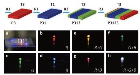 圖2 平行結(jié)構(gòu)RGB半導(dǎo)體納米薄片生長(zhǎng)示意圖以及產(chǎn)生的白光激光與多色激光(圖片來(lái)源:《Nature Nanotechnology》)