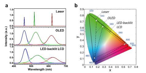 圖4 激光顯示技術(shù)于傳統(tǒng)顯示技術(shù)光譜的色域比較(圖片來(lái)源:《Fabrication and Characterization of Semiconductor Nanolasers》)