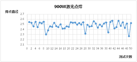 4)結(jié)論:焊點(diǎn)尺寸范圍為2.43~2.97mm,平均焊點(diǎn)尺寸2.76mm,焊點(diǎn)波動7.6%,焊點(diǎn)均勻、出光穩(wěn)定,能滿足精密焊接需求。