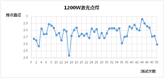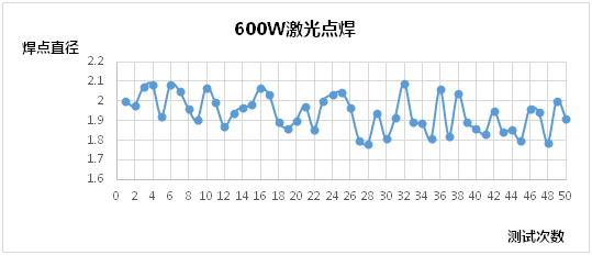 4)結(jié)論:焊點(diǎn)尺寸范圍為1.1~1.3mm,平均焊點(diǎn)尺寸1.22mm,焊點(diǎn)波動9.8%,焊點(diǎn)均勻、出光穩(wěn)定,能滿足精密焊接需求。