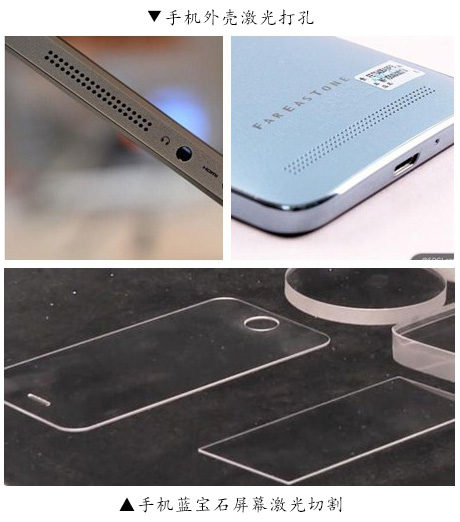 激光切割:藍寶石玻璃手機屏幕激光切割、攝像頭保護鏡片激光切割、手機Home鍵激光切割、FPC柔性電路板激光切割、手機聽筒網(wǎng)激光打孔等。