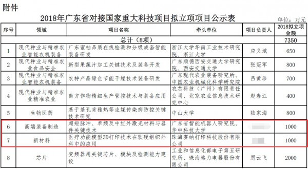 近日科技廳已經(jīng)發(fā)布了公示名單。筆者看到由廣東省智能機(jī)器人研究院、華中科技大學(xué)聯(lián)合申報(bào)的《超短脈沖、單頻及中紅外激光材料與器件關(guān)鍵技術(shù)》和珠海賽納打印科技股份有限公司申報(bào)的《醫(yī)療功能模型3D打印技術(shù)在軟硬組織外科中的應(yīng)用》項(xiàng)目入選,分別獲得立項(xiàng)金額1000萬元。隨著國家層面對(duì)激光技術(shù)和3D打印的科研投入增加,近幾年廣東省科技部門也加大了對(duì)這兩項(xiàng)技術(shù)的科研資金扶持。