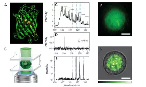 圖1.單細胞激光器 A 綠色熒光蛋白三維結(jié)構(gòu) B 單細胞激光示意圖 C D E分別是低于閾值,閾值附近和高于閾值的出光模式 F G分別是低于閾值和高于閾值細胞內(nèi)出光的空間分布模式