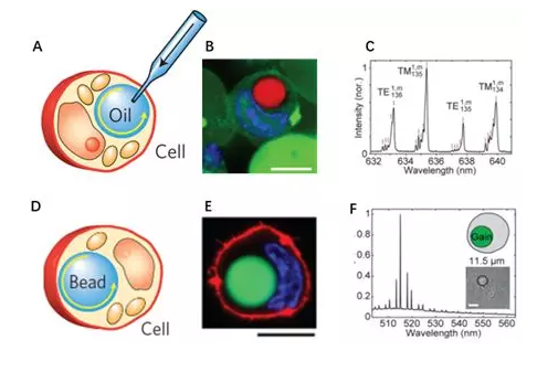 圖2 基于回音壁微球腔的細胞內(nèi)激光器 A 將油滴注入細胞內(nèi)示意圖 B含有油滴的細胞,紅色為尼羅紅染色的油滴,藍色為細胞核 C 基于油滴微腔的細胞內(nèi)激光輸出 D 細胞內(nèi)吞微球示意圖 E 內(nèi)吞聚苯乙烯微球的細胞,紅色為細胞膜,藍色為細胞核F 基于聚苯乙烯微球腔的細胞內(nèi)激光輸出。