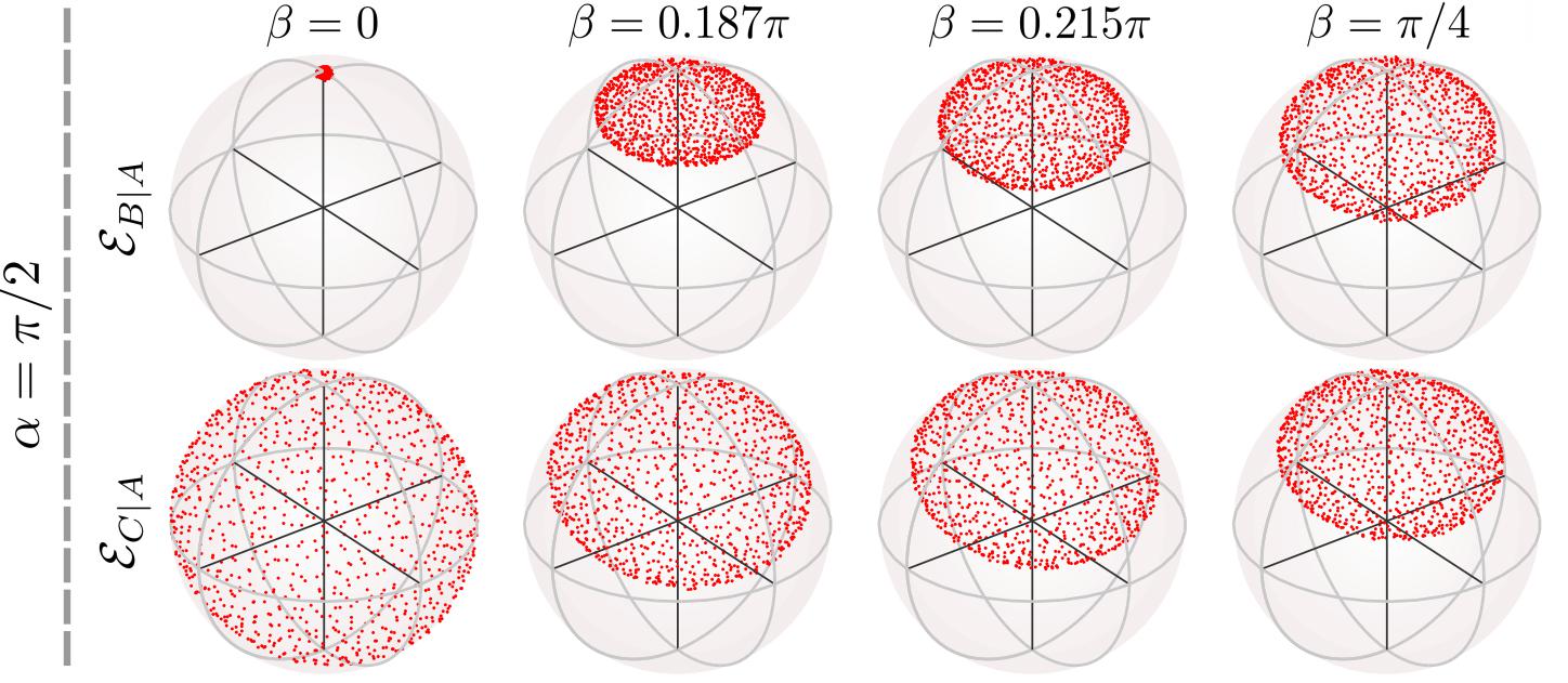 在共享的量子態(tài)不理想,或者多方共享量子態(tài)的情況下,Alice將不能將Bob的系統(tǒng)導(dǎo)引到任意的量子態(tài)上。此時(shí)Alice所能導(dǎo)引Bob的量子態(tài)的集合在Bloch表示下將構(gòu)成一個(gè)橢球。我們知道單比特量子態(tài)可以可視化地表示為Bloch球中的一個(gè)矢量,而量子導(dǎo)引橢球則為兩比特量子態(tài)提供了一個(gè)簡(jiǎn)單的可視化表示方法。在多方共享量子態(tài)的情況下,量子導(dǎo)引橢球具有體積單配性。例如Alice, Bob和Charlie共享一個(gè)三比特糾纏純態(tài),則Alice導(dǎo)引Bob和Alice導(dǎo)引Charlie的橢球體積存在一個(gè)簡(jiǎn)潔的單配關(guān)系,即改變參數(shù)使一個(gè)導(dǎo)引橢球的體積變大時(shí),另一個(gè)導(dǎo)引橢球的體積則會(huì)變小。