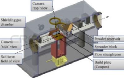 開放式架構(gòu)PBF系統(tǒng)的示意圖,其中包括對(duì)高速成像和紋影成像的修改。科學(xué)家們使用開放式結(jié)構(gòu)PBF系統(tǒng)進(jìn)行現(xiàn)場測量,提供完全密集組件的自動(dòng)構(gòu)建。電腦提供了構(gòu)建板在層之間的垂直移動(dòng)、硅繩粉末涂布機(jī)的運(yùn)動(dòng)、激光照射和掃描和靈活性可用于激光功率和速度。