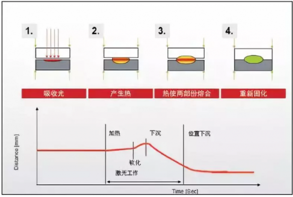 同時由于材料本身的熱膨脹擴(kuò)張產(chǎn)生內(nèi)部壓力,內(nèi)部壓力與外部壓力共同作用確保了兩部分的堅(jiān)固焊接。以上兩圖直觀地說明了塑料激光焊接的原理與過程。