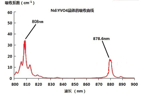 固體激光器是一種通過諧振腔與摻雜晶體將泵浦光能量轉(zhuǎn)換為信號光的裝置,其中泵浦光主要由半導體激光器提供。半導體激光器是固體激光器的核心器件之一。工業(yè)固體激光的摻雜晶體大多摻雜稀土元素Nd3+離子,常見的如Nd:YAG、Nd:YVO4等,其泵浦源多采用808nm波段或878nm波段的半導體激光器。以Nd:YVO4為例,其光譜吸收譜線如下圖所示: