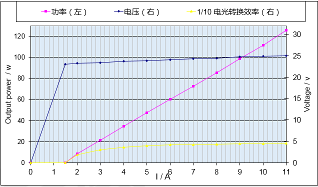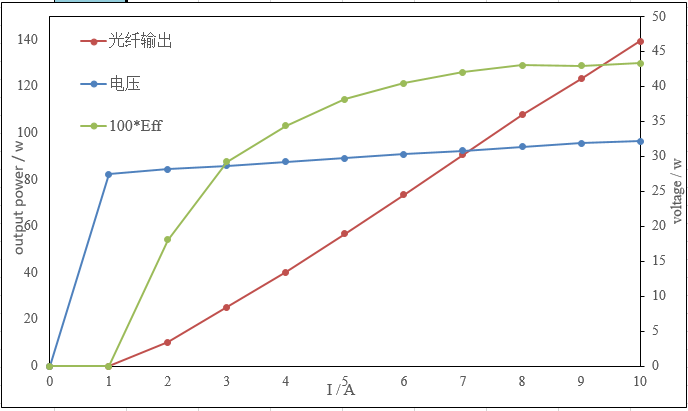 (1)808nm泵浦源產(chǎn)品,400μm輸出光纖芯徑輸出功率25W-120W(如圖4,5),波長范圍控制在±3nm,光譜寬度(FWHM)<3nm,經(jīng)客戶實測光光轉(zhuǎn)換效率達到53%。