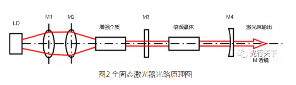全固態(tài)激光器具有峰值功率高、穩(wěn)定性好、光束 質(zhì)量高、體積小等優(yōu)點,具有更廣的應(yīng)用前景。固體 激光器的紫外激光產(chǎn)生過程主要分為以下兩個步驟: 1) 泵浦光源經(jīng)激光器內(nèi)光路照射到增強介質(zhì)上,實現(xiàn) 粒子數(shù)反轉(zhuǎn),在諧振腔內(nèi)形成紅外光,作為基波;2) 基波在諧振腔內(nèi)振蕩,經(jīng)過一次或多次非線性晶體腔 內(nèi)倍頻,得到所需的紫外譜線后經(jīng)鏡片透射、反射從 諧振腔輸出。紫外固體激光器采用的泵浦方式主要分 為燈泵浦和激光二極管(LD)泵浦,其中LD泵浦的紫 外固體激光器又被稱為全固態(tài)激光器,其光路原理如圖2所示。
