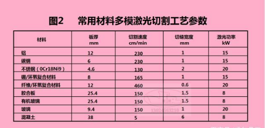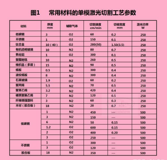 在相同功率下多模的聚焦性差,切割能力低,單模激光的切割能力由于多模。比如,300W的單模激光和500W的多模有同等的切割能力。常用材料的單模激光切割工藝參數(shù)見圖1;多模激光切割工藝參數(shù)簡圖2。