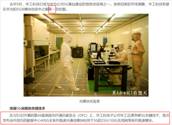 此外,該報道還指出,華工科技去年9月拿到5G光模塊國內(nèi)首單,10月開始小批量供貨后,今年5月產(chǎn)能開始放量。