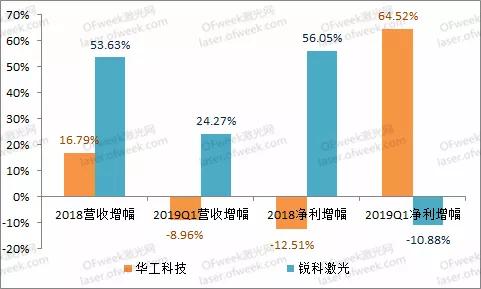 增長(zhǎng)率方面,銳科激光2019年一季度凈利潤(rùn)同比下降10.88%,華工科技同期數(shù)據(jù)為64.52%。而在2018年?duì)I收增幅、2019年一季度營(yíng)收增幅、2018年凈利潤(rùn)增幅三方面,銳科激光表現(xiàn)都優(yōu)于華工科技。