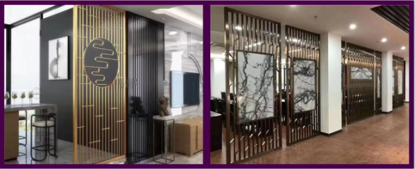 除了燈飾外,在一些的裝飾項(xiàng)目中,為了襯托室內(nèi)的布置、線形、色調(diào),通過吸取傳統(tǒng)裝飾的特征,和深厚的傳統(tǒng)文化內(nèi)涵,通過激光切割工藝加工的不銹鋼隔斷屏風(fēng),不僅糅合現(xiàn)代西式家居的舒適,還能營造出空間的層次感。玫瑰金,古銅色、金黃色等不同顏色的選擇更突顯了不同的裝飾風(fēng)格及品位。別墅、ktv、美容院、商品寫字樓、星級酒店、娛樂會(huì)所里大量在使用這種激光不銹鋼鏤空工藝,且圖形新穎多樣。