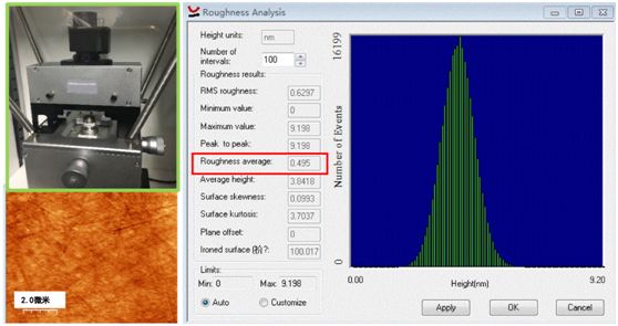 超光滑表面除了面形精度和表面粗糙度要求極高以外,還要求表面有完好的晶格結(jié)構(gòu)、無缺陷,能消除加工損傷層。關(guān)鍵在最后一道工序:超精密拋光技術(shù)。波長光電的超光滑表面加工工藝結(jié)合了傳統(tǒng)的機械去除法以及磁性拋光法,達到表面粗糙度低于5?。原子力顯微鏡的測試結(jié)果如圖一。