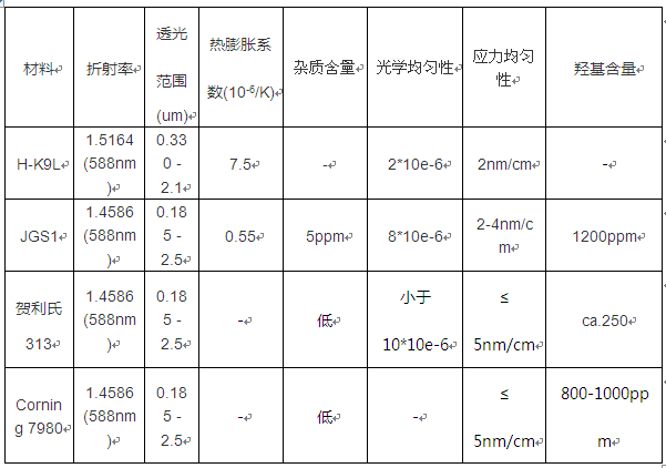 對于紫外、YAG光纖和半導體激光器等,常用的光學元件材料有H-K9L、紫外熔石英(JGS1)、賀利氏313和康寧7980等。相比較于K9玻璃,石英玻璃有更低的熱膨脹系數(shù),更少的雜質(zhì)含量,更好的光學均勻性,因而受到高功率激光市場的青睞。在高功率和超快激光應(yīng)用領(lǐng)域,國內(nèi)廠家更傾向于國外的賀利氏和康寧材料。