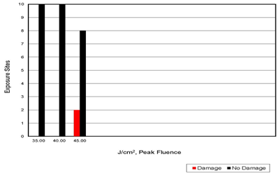 我們用離子束反應(yīng)濺射沉積設(shè)備制備了氧化鉿和二氧化硅激光增透膜,并對此薄膜進行了光學性質(zhì)、結(jié)構(gòu)特性以及激光損傷性能進行了研究。結(jié)果表明,用雙離子束反映濺射沉積的激光薄膜不僅膜層致密,而且具有極低的散射和吸收,均勻的非晶結(jié)構(gòu),雜質(zhì)缺陷少,激光損傷闞值高。檢測的激光損傷閾值為40J/cm2,如圖二所示。檢測條件:測試激光波長為1 064nm,脈沖寬度為10 ns,樣品的測試采用1-on-1的方式進行,取0損傷幾率時的能量密度作為樣品的損傷閾值。目前還存在的問題是成膜材料的純度有待提高。