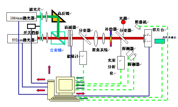 該系統(tǒng)具有一下三種特點及優(yōu)勢:首先,相互補充、互為校對的多種損傷判別方法。每種損傷判別方法都有一定的局限性和應(yīng)用范圍,單一的損傷判別方法難以對不同厚度、不同膜系的薄膜均做出準確的判別。本套系統(tǒng)集成了多種檢測方法:圖像檢測、散射檢測、光譜檢測、聲譜檢測等,這些方法相互補充、互為校對,拓展了測試對象的應(yīng)用范圍,為整體系統(tǒng)的測試穩(wěn)定提供了有力的保障。其次,高倍率的樣品在線檢測復核系統(tǒng)。由于工作距的限制,目前測試系統(tǒng)中圖像判別法采用的CCD放大倍率只能達到50倍以下,不滿足國際標準規(guī)定的100倍的要求。對此,系統(tǒng)配備了高倍變焦顯微鏡校驗系統(tǒng),方便用戶在不影響測試過程,不拆卸樣品的情況下,對損傷點的實際情況進行在線復查,保證了對準精度。另外,雙波長共光路的系統(tǒng)設(shè)計。本儀器具有單波長(1064nm或者532nm)和雙波長(1064nm和532nm)兩種類型。針對雙波長測試儀,采用兩臺激光器,經(jīng)過合色棱鏡,合并在一束光路上,簡化了光學系統(tǒng)結(jié)構(gòu),可對同一點,實現(xiàn)雙波長激光的同時預處理。