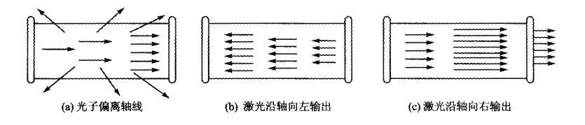 當(dāng)工作物質(zhì)產(chǎn)生受激福射時,受激輻射在兩反射鏡之間作一定次數(shù)的往返反射,而每次返回時都會經(jīng)過建立了粒子數(shù)反轉(zhuǎn)分布的工作物質(zhì),這樣將使受激輻射一次又一次地加強,如下圖所示。這樣幾十次、幾百次的往返,直至能獲得單方向的強度非常集中的激光輸出為止。我們把激光在共振腔內(nèi)的往返放大過程叫做振蕩放大。被激發(fā)的工作物質(zhì)中的某些原子受激輻射而放出光子,如果發(fā)射方向正好和腔軸線平行,則可能在腔內(nèi)起放大作用。一部分偏離軸線方向的光子則跑出腔外面而成為一種損耗,如圖(a)所示。若光在來回反射過程中,放大作用克服了各種衰減作用(如共振腔的透射、工作物質(zhì)對光的散射和吸收等),就形成穩(wěn)定的光振蕩而產(chǎn)生激光,以很好的方向沿軸向輸出,如圖(b)和圖(c)所示。