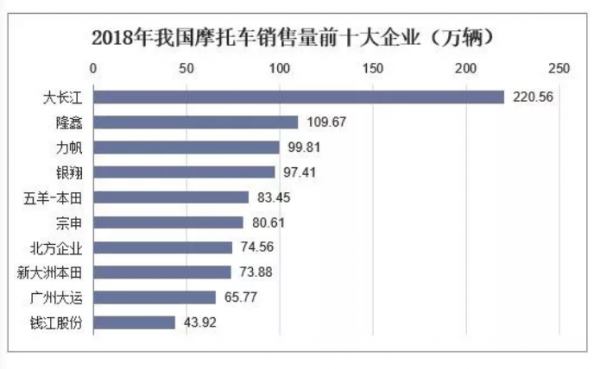 中國摩托車生產(chǎn)企業(yè)主要集中在廣東、重慶、江浙這三大板塊。2018年,(廣東江門)大長江集團(tuán)以220.56萬輛的年銷量穩(wěn)占第一的位置,是銷售量排名第二的企業(yè)(重慶)隆鑫109.67萬輛的兩倍,排名第三的(重慶)力帆為99.81萬輛。