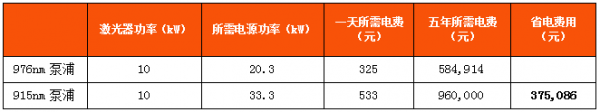 摻鐿光纖在976nm的吸收率是915nm泵浦波長的3倍以上,976nm泵浦技術(shù)方案的單模高功率相比915nm泵浦技術(shù)路線,可以實(shí)現(xiàn)3-5kW的單模組高功率激光器,3000W以內(nèi)可現(xiàn)實(shí)M2<1.2,同功率單模產(chǎn)品可實(shí)現(xiàn)的光束質(zhì)量更高。同時(shí),相比于國內(nèi)的915nm泵浦路線的25-30%光電轉(zhuǎn)化效率,976nm泵浦技術(shù)路線光電轉(zhuǎn)化效率超過42%,在6kW以上的超高功率激光器節(jié)能省電特點(diǎn)及帶來的經(jīng)濟(jì)性被充分認(rèn)識并且是各大激光設(shè)備商一直追逐的方向。如下表所示,10kW的將會(huì)省電近40萬元,這將會(huì)給終端客戶帶來巨大的經(jīng)濟(jì)效用。
