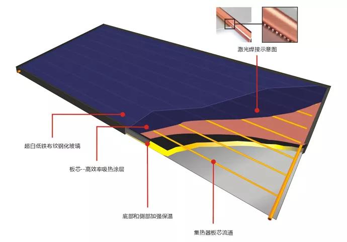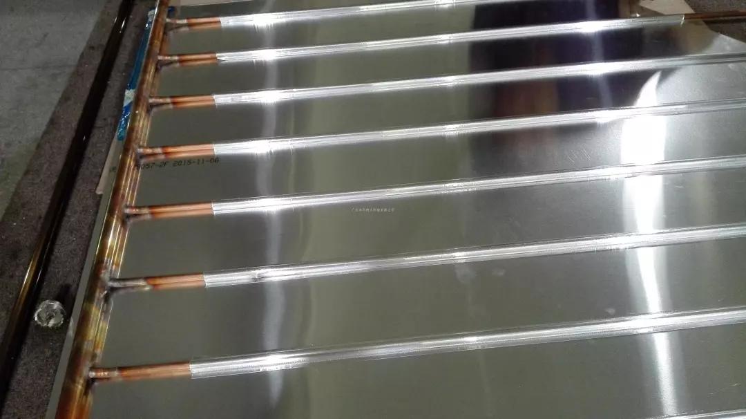 平板太陽(yáng)能產(chǎn)品性能的好壞,最直接的判斷方法是水箱的升溫效率。水箱的升溫效率受一系列因素影響,而吸熱板是其中最主要的因素。利用激光焊接來(lái)進(jìn)行太陽(yáng)能集熱器板芯流道與高選擇性吸熱涂層的焊接,在吸熱涂層上間隔幾毫米焊一個(gè)點(diǎn),結(jié)合強(qiáng)度、吸熱涂層的完整度高,從而使板芯具有更高的吸熱效能。
