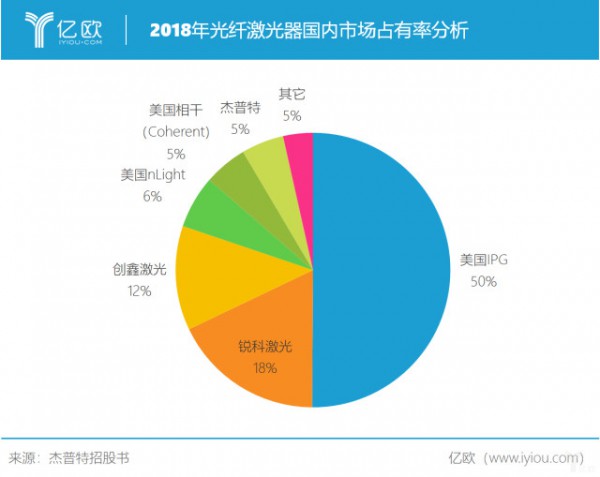 從2018年光纖激光器的市場占有率來看,開創(chuàng)了中國商用脈寬可調高功率脈沖光纖激光器先河的杰普特,也難逃被巨頭排擠的厄運。數(shù)據(jù)表明,2018年杰普特的光纖激光器份額僅占國內市場的5%,以美國IPG為主的光纖激光器企業(yè)占領了國內60%的市場份額。