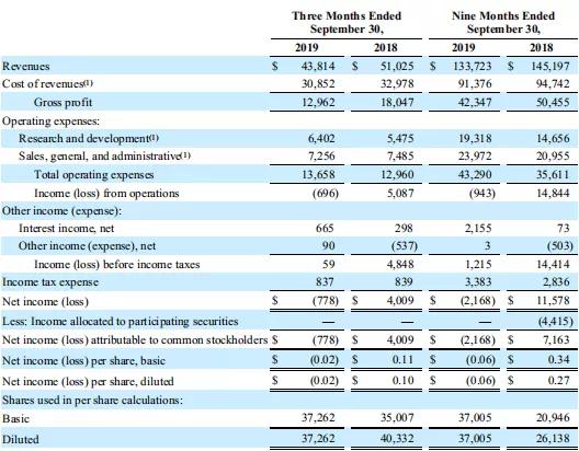 當地時間11月4日,高功率半導體和光纖激光器的領先供應商恩耐公司公布了2019年第三季度的財務業(yè)績。報告顯示,恩耐2019年第三季度的收入為4381.4萬美元,同比下降14.1%;凈虧損80萬美元,去年同期凈利潤為400.9萬美元;第三季度毛利率為29.6%,同比下降6個百分點(2018年第三季度為35.4%)。而2019年前三季度總營收為1.34億美元,同比下降7.9%;凈虧損為216.8萬美元,去年同期凈利潤為1157.8萬美元;毛利率為31.7%,同比下降3個百分點(2018年前三季度為34.8%)。