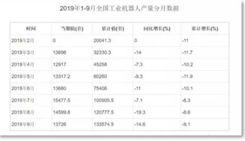 自2018年9月份以來,中國工業(yè)機器人產(chǎn)量已連續(xù)12個月下滑(至2019年9月)。