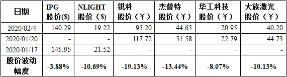 新型冠狀病毒自2020年1月20日鐘南山院士確認(rèn)稱(chēng)新冠肺炎肯定存在人傳人以來(lái),疫情不斷發(fā)展,受感染人數(shù)不斷增加,截至2020年2月5日,目前湖北省感染人數(shù)24377,中國(guó)感染人數(shù)16678,中國(guó)的經(jīng)濟(jì)及一定程度的世界經(jīng)濟(jì)都遭受影響。激光行業(yè)作為一個(gè)具有明顯全球化特征的行業(yè)及應(yīng)用,當(dāng)然在此疫情上亦受到較大的沖擊,一些典型的激光器及設(shè)備上市公司這幾日的股價(jià)受到明顯的波動(dòng),國(guó)際國(guó)內(nèi)的相關(guān)股票價(jià)格變動(dòng)如下: