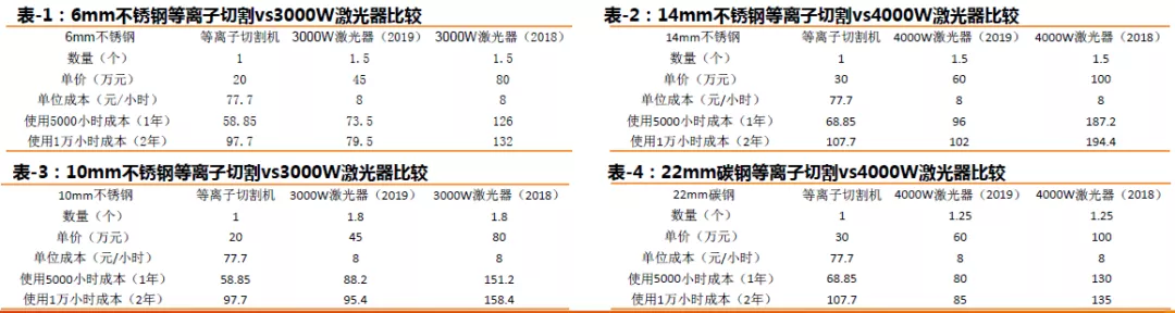 如上圖所示,光纖激光切割正在替代或?qū)⑻娲羟袡C(jī)床、等離子切割機(jī)、高壓水切割、火焰切割機(jī)及氣體/固體激光切割等傳統(tǒng)加工方案。比如,如下所示,目前激光切割綜合成本出現(xiàn)出低于等離子切割綜合成本,同時(shí)隨著設(shè)備價(jià)格的進(jìn)一步下降及激光加工工藝的進(jìn)一步優(yōu)化,其綜合性?xún)r(jià)比優(yōu)勢(shì)越發(fā)突顯。