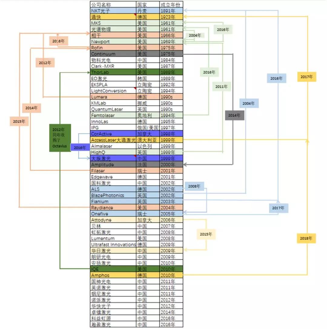 全球超快激光企業(yè)成立時(shí)間表及收購(gòu)關(guān)系(來(lái)源:平安證券)