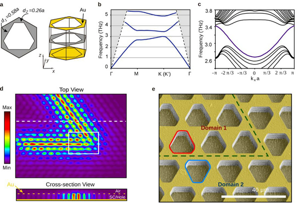 拓?fù)溥吘墤B(tài)是由沿著順時針(CW)或逆時針(CCW)方向傳播的簡并對組成,其具有相同的強度分布、增益和垂直耦合速率。耦合模理論預(yù)測,每個拓?fù)涞募す饧ど淠6加梢粋€CW和CCW模式等權(quán)疊加組成。CW和CCW模式模式的共存也解釋了為什么圖2中諧振腔中即使存在缺陷引起的后向散射也不會破壞行波特性。為了驗證這一點,研究人員在三角形激光諧振腔下方引入了一個額外的直形拓?fù)洳▽?dǎo)(圖4a)。每一個CW(CCW)模式倏逝耦合到直波導(dǎo),向右(左)傳播,然后通過二階光柵將其輸出。實驗表明該激光器支持三種拓?fù)溥吘墤B(tài)激光模式。通過選擇性地遮蓋器件的左側(cè)或右側(cè),可以觀察到每個激射模式從這兩個方向發(fā)出的強度大約相等(圖4c),這表明CW和CCW模式具有相同的權(quán)重。作為比較,可以觀察到,在高抽運電流下,同樣的樣品也在鄰近的頻率范圍內(nèi)(大約3.4 THz)支持非拓?fù)涞募ど淠J?。這些非拓?fù)涞募ど淠J綇膬蓚€方向輸出非常不同的強度(圖4d)。這證明了拓?fù)溥吘墤B(tài)和非拓?fù)溥吘墤B(tài)激光模式在同一器件中的性質(zhì)差異。