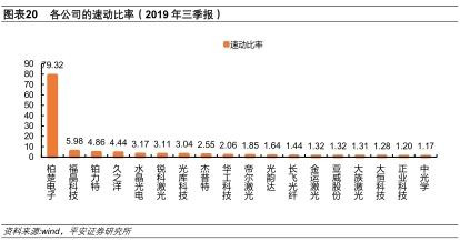 此外,債務(wù)為上市公司現(xiàn)金流帶來的壓力也普遍不大。激光裝備制造業(yè)并不是一個(gè)高負(fù)債的行業(yè),從2019年Q3的數(shù)據(jù)看,相關(guān)上市公司中僅一家資產(chǎn)負(fù)債率高于50%。從2019年Q3的速動(dòng)比率來看,行業(yè)內(nèi)所有上市公司均超過1倍,約半數(shù)的上市公司超過2倍,風(fēng)險(xiǎn)整體可控。