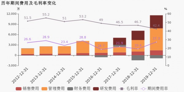 公司2019年?duì)I業(yè)成本2.3億,同比增長45.9%,高于營業(yè)收入35.1%的增速,導(dǎo)致毛利率下降4.3%。期間費(fèi)用率為27.3%,較上年升高7.9%,對公司業(yè)績形成拖累。經(jīng)營性現(xiàn)金流大幅上升153.1%至7420.9萬。公司研發(fā)投入大幅增加,相比去年同期增長40.5%達(dá)到3782.3萬。研發(fā)投入全部費(fèi)用化,不作資本化處理。