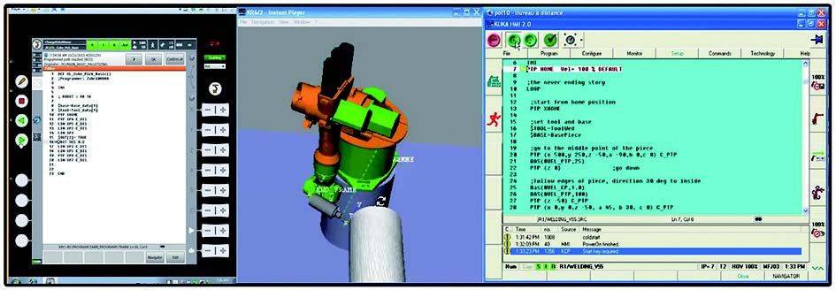首先打開虛擬機(jī) VMWare Work station,在虛擬機(jī)內(nèi)部的虛擬系統(tǒng)環(huán)境下運(yùn)行 KUKA Officelite 軟件。然后查看虛擬機(jī)的 IP 地址,在 SimPro2.2 軟件的 KRC 選項(xiàng)中,修改VRC Host 為虛擬機(jī) 的 IP 地址,Configuration 選擇與實(shí)際設(shè)備一致的 KRC2- KR30HA_3 -FLOOR。點(diǎn)擊左下角 KR30HAAction 欄 下 的 Download RSL 按 鈕, 虛 擬 機(jī) 中 的 KUKAOfficelite 軟件已經(jīng)自動運(yùn)行,如圖 5 所示。KUKA Officelite軟件自動把離線編程的動作編譯成 KRC 機(jī)器人控制器內(nèi)可調(diào)用的程序,儲存在 Program 文件夾下,將兩個文件拷貝到KRC 控制器中。