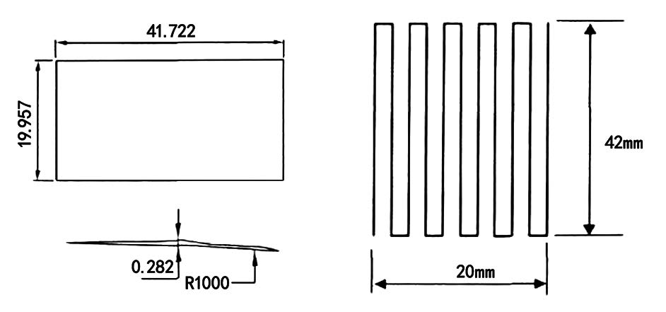 從第一破損區(qū)的工程圖可以看出該區(qū)域長度約為42mm,寬度約為 20mm,如圖 3 所示。雖然是曲面,但由于半徑達(dá)到了 1000mm,可以簡化為平面處理。通過一些基礎(chǔ)實(shí)驗(yàn)得到的經(jīng)驗(yàn)來看,鋁合金激光熔覆功率 800W,掃描速度 5mm/s,掃描間距 2mm 時(shí)效果較好,此時(shí)的熔覆層高度約為 0.5mm,大于破損區(qū)域的 0.282mm,所以只需要熔覆一層即可,本次激光熔覆的編程,如圖 3 所示。長度方向上共有 11 道。