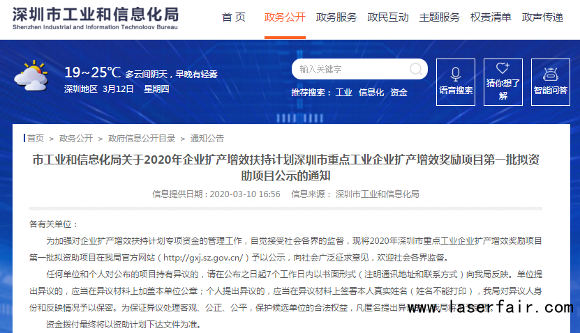 通知提出:為加強對企業(yè)擴產(chǎn)增效扶持計劃專項資金的管理工作,自覺接受社會各界的監(jiān)督,現(xiàn)將2020年深圳市重點工業(yè)企業(yè)擴產(chǎn)增效獎勵項目第一批擬資助項目在我局官方網(wǎng)站(http://gxj.sz.gov.cn/)予以公示,向社會廣泛征求意見,歡迎社會各界監(jiān)督。