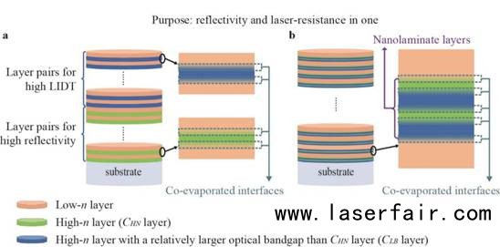 在這項(xiàng)工作中,研究團(tuán)隊(duì)展示了一種基于共蒸界面納米疊層的“集高反射率和高激光損傷閾值于一體”的反射薄膜設(shè)計(jì)方法。在這種設(shè)計(jì)方法中,采用兩種材料交替的納米疊層作為一層具有高折射率和大光學(xué)帶隙的等效層,取代傳統(tǒng)組合膜系設(shè)計(jì)中的高折射率膜層。在保持總光學(xué)厚度不變的前提下,通過(guò)改變納米疊層中兩種材料的厚度比例,可以調(diào)節(jié)納米疊層薄膜的(平均)折射率和光學(xué)帶隙。這使得發(fā)展出同時(shí)具備高反射率和高激光損傷閾值的紫外反射薄膜成為可能。隨后,研究團(tuán)隊(duì)使用電子束沉積技術(shù),在實(shí)驗(yàn)上證明了基于Al2O3-HfO2納米疊層的反射薄膜在紫外波段具有更高的反射率、帶寬和激光損傷閾值,適用于紫外激光領(lǐng)域。與傳統(tǒng)組合膜系設(shè)計(jì)相比,該納米疊層設(shè)計(jì)的紫外激光反射薄膜(兩者總膜層厚度接近)具有若干優(yōu)點(diǎn)。首先,納米疊層設(shè)計(jì)薄膜在紫外波段具有更高的反射率和更寬的帶寬,同時(shí)在可見至近紅外波段具有更低的透射波紋;其次,納米疊層設(shè)計(jì)薄膜中電場(chǎng)強(qiáng)度隨膜層深度衰減的更快,節(jié)瘤缺陷引起的電場(chǎng)增強(qiáng)更低,薄膜中的吸收更低,從而具有更高的紫外激光損傷閾值;最后,該技術(shù)適用于大尺寸(對(duì)角線尺寸達(dá)米級(jí))激光薄膜的制備。研究團(tuán)隊(duì)利用納米疊層的折射率和光學(xué)帶隙可調(diào)諧的特性來(lái)設(shè)計(jì)超越傳統(tǒng)紫外激光薄膜性能的新型紫外激光反射薄膜,為提高激光薄膜綜合性能提供了一種重要的技術(shù)途徑?;诩{米疊層的激光薄膜設(shè)計(jì)思想在未來(lái)可以通過(guò)改變疊層材料種類和厚度比例進(jìn)一步拓展從而形成其他高綜合性能的激光薄膜元件。據(jù)悉,本論文的核心概念已提交了中國(guó)發(fā)明專利申請(qǐng)。