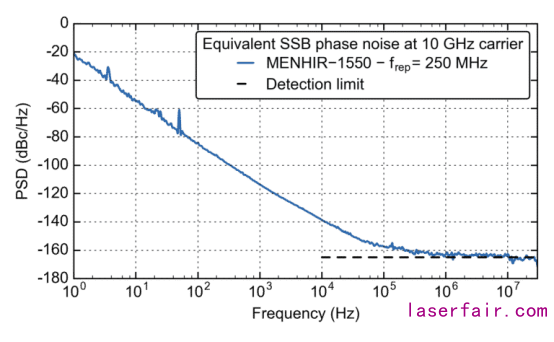 Fig 1.:(上) 在10GHz諧波上測(cè)量250MHz重頻的MENHIR-1550激光器的位相噪聲功率譜;