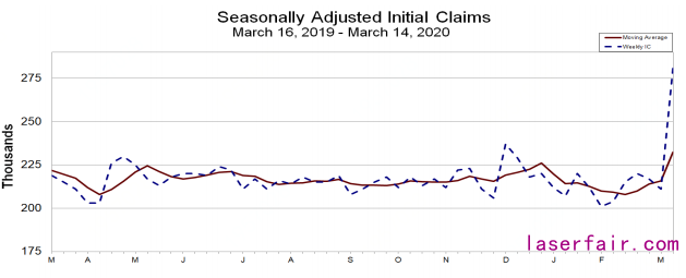 美國(guó)勞工部周四公布,截至3月14日當(dāng)周首次申請(qǐng)失業(yè)金人數(shù)激增7萬(wàn)人,經(jīng)季調(diào)后為28.1萬(wàn)人。不僅創(chuàng)下自2012年11月颶風(fēng)“桑迪”襲擊美國(guó)東海岸以來(lái)最大增幅,總數(shù)也攀升至2017年9月以來(lái)最高水平。首次申請(qǐng)失業(yè)金人數(shù)四周移動(dòng)均值增加了1.65萬(wàn),至23.23萬(wàn)人,為自2018年1月以來(lái)的最高水平。
